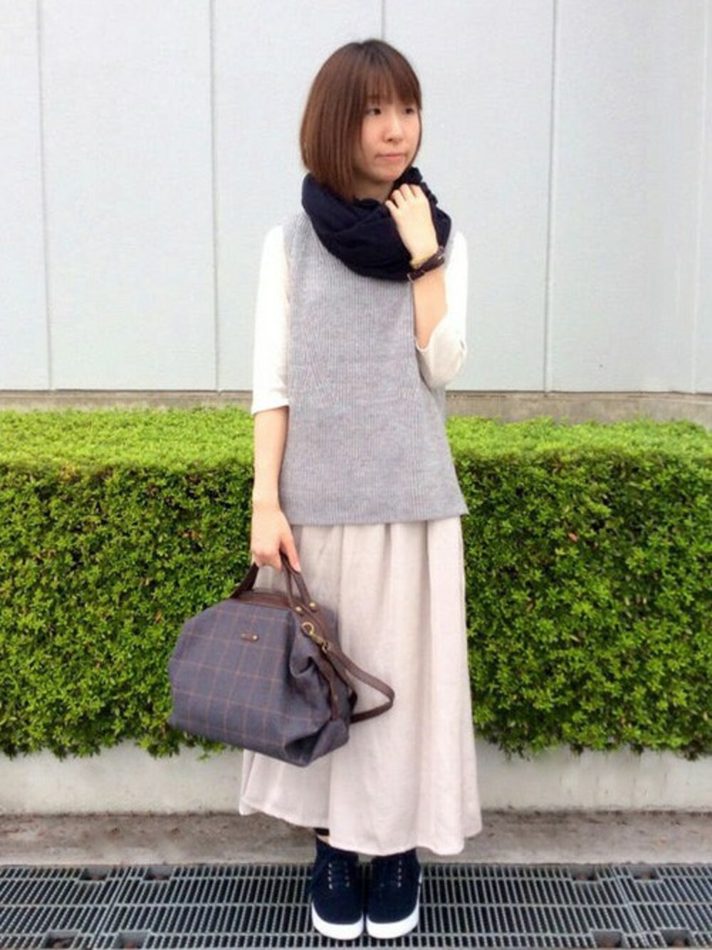 やさしいカラーのワントーンコーディネートです。 トレンドのハイネックベストは、暑さの残る時期には一枚で、秋にはシャツとレイヤードしてなどアレンジ力も高め。 少し光沢のあるサテンスカートとあわせて縦ラインすっきりさせました。 スヌードとスニーカーは、濃いカラーにしてアクセントに。 コロンとしたシルエットが特徴的なボストンは、すこしレトロな雰囲気でこの秋冬に活躍しそうです♪