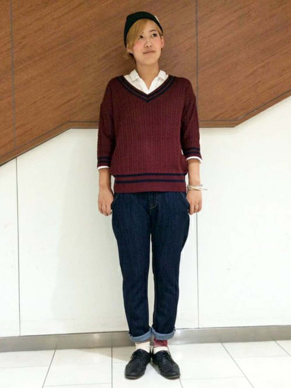 秋のデニムコーディネートです。 人気急上昇中のチルデンニットは、デコルテラインがキレイにみえるVネックで小顔効果も期待できます。 シャツとあわせるとプレッピーな印象に♪ 濃いめのデニムは、どんなスタイルにもあわせやすい定番タイプです。 ブラックの小物をあわせてボーイッシュにまとめました。
