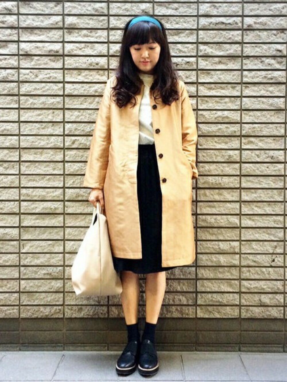 秋におすすめのきれいめコーディネートです。 キャメルカラーのステンカラーコートは、張りのある生地感と光沢感がポイントになっています。 インは、トレンドのプチハイネック風ブラウスとプリーツスカートでシックにまとめました♪
