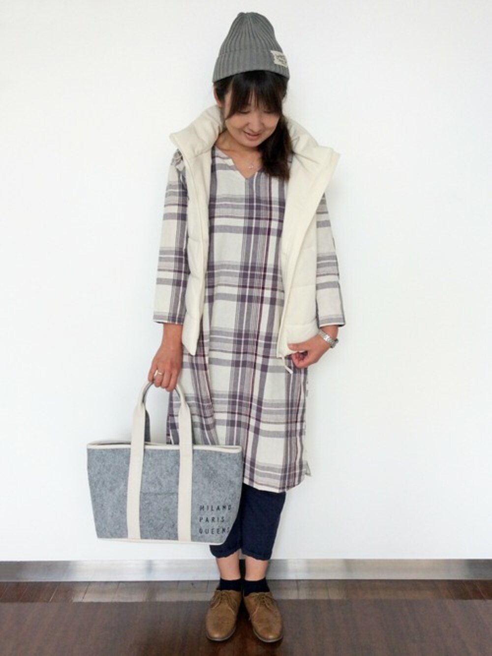 ワンピース×ベストのレイヤードスタイルです。 チェックのワンピースは、ノーカラーで首元すっきり。 白いカラーがかわいい中綿のベストは、部分的に綿の量を調節しコンパクトなシルエット。 今年は、スカートやワンピースとあわせて、ミックスコーデを楽しみたいです♪