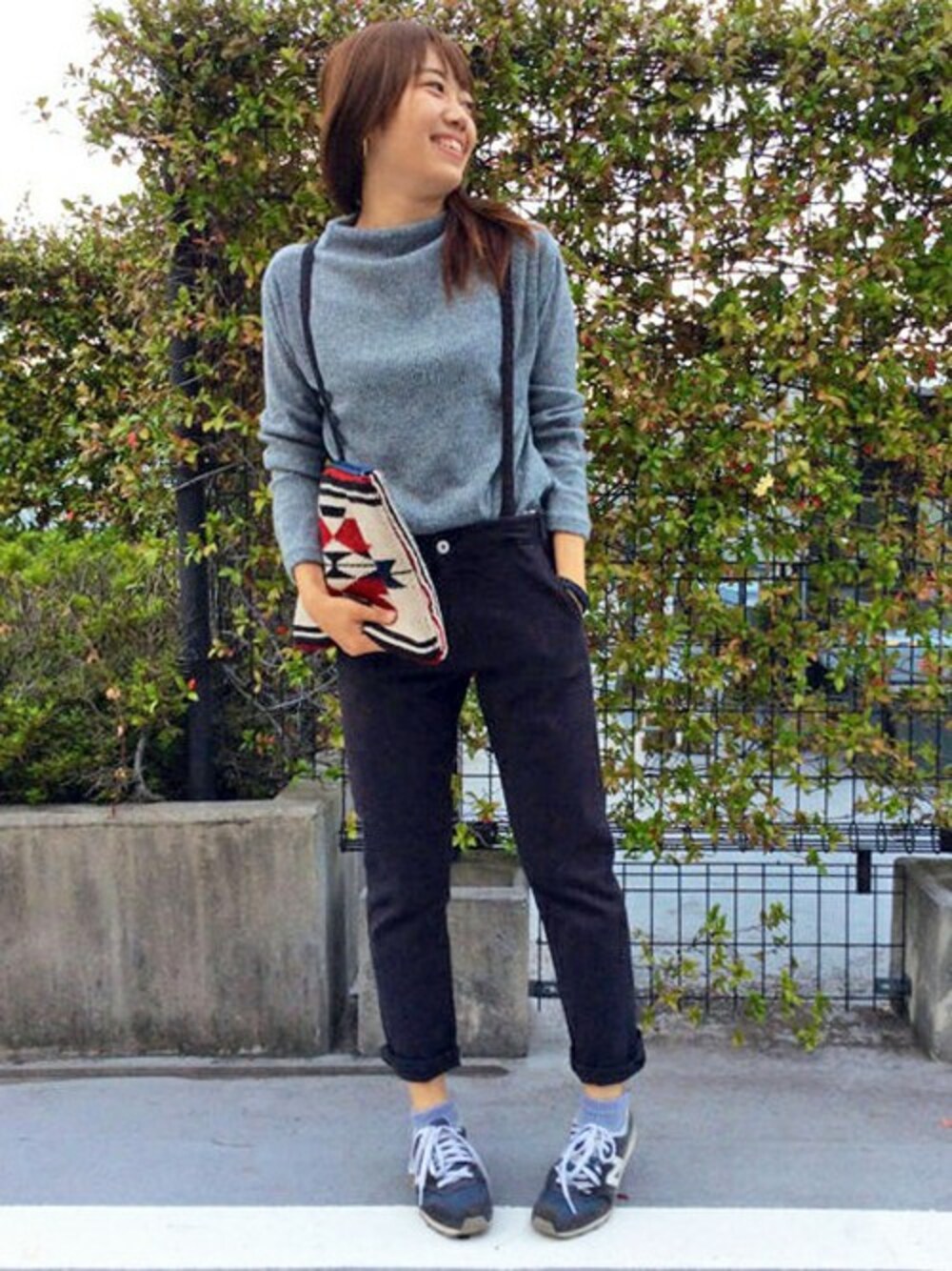 ニットのトップスインスタイル。 シンプルなコーディネートも、細めのサスペンダーがこなれ感をだしてくれます♪ ネイティブな幾何学柄のクラッチバッグをアクセントに。