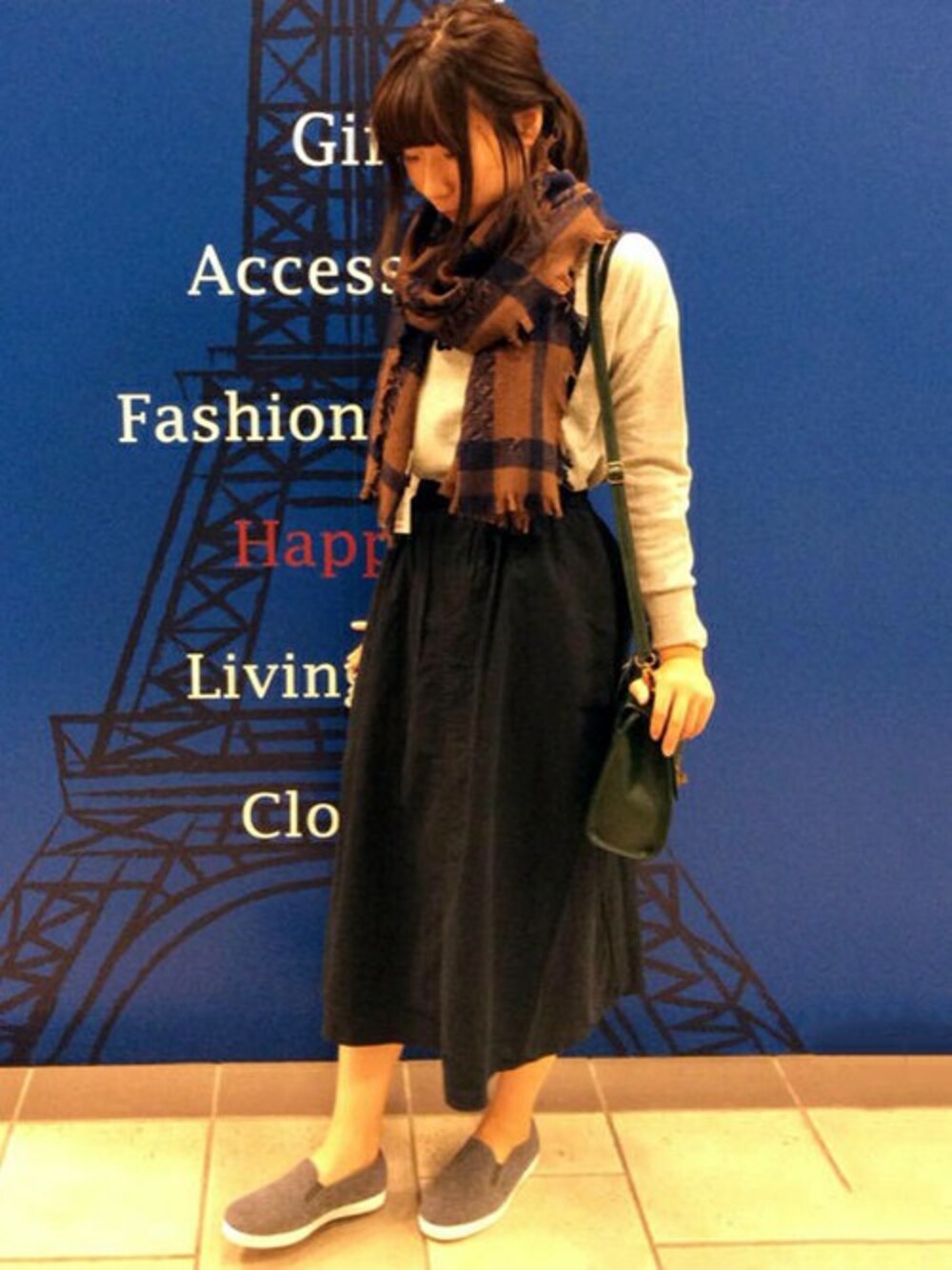 休日のショッピングにピッタリな秋のスカートスタイル。 スウェットのようなトップスは、ニット素材でやわらかな風合いが特徴です。 ミモレ丈のギャザースカートは、サスペンダー付で着まわしアレンジが楽しめる一枚。 今年らしいフリンジ使いのチェックストールを首元にまいてアクセントに♪