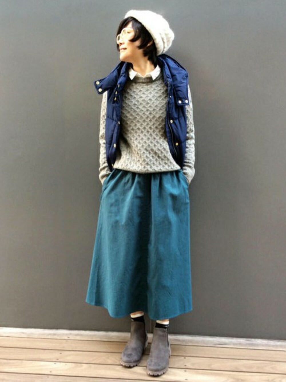 グレー×ブルーのカラー使いが新鮮な秋のコーディネートです。 トップスは、ジャガードならではのやさしい風合いが女性らしい印象のニット。 ハイネックやシャツをのぞかせると今年らしさがUPします。 深みのあるブルーが印象的なスカートは、サスペンダー付で着回しアレンジ力◎ 全体にちょっとだけホワイトをプラスすることで、メリハリのあるスタイリングに♪