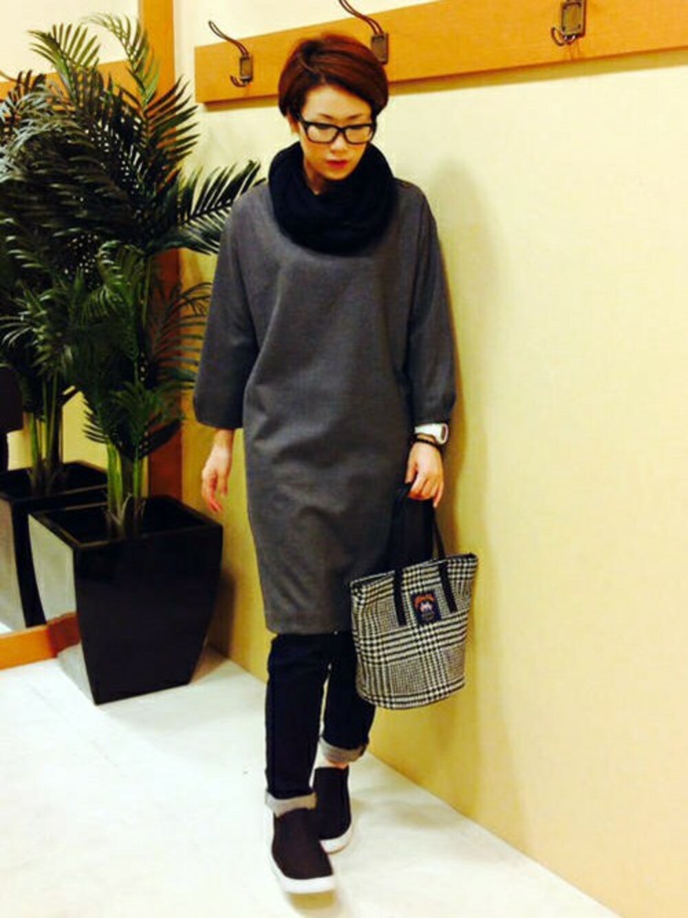 ダークカラーのワントーンコーディネートです。 重くなりすぎないように、小物使いやロールアップでメリハリをつけるのがポイントです。 ほっこりシルエットのワンピースは、一枚でスッキリ着るときれいめスタイルに♪