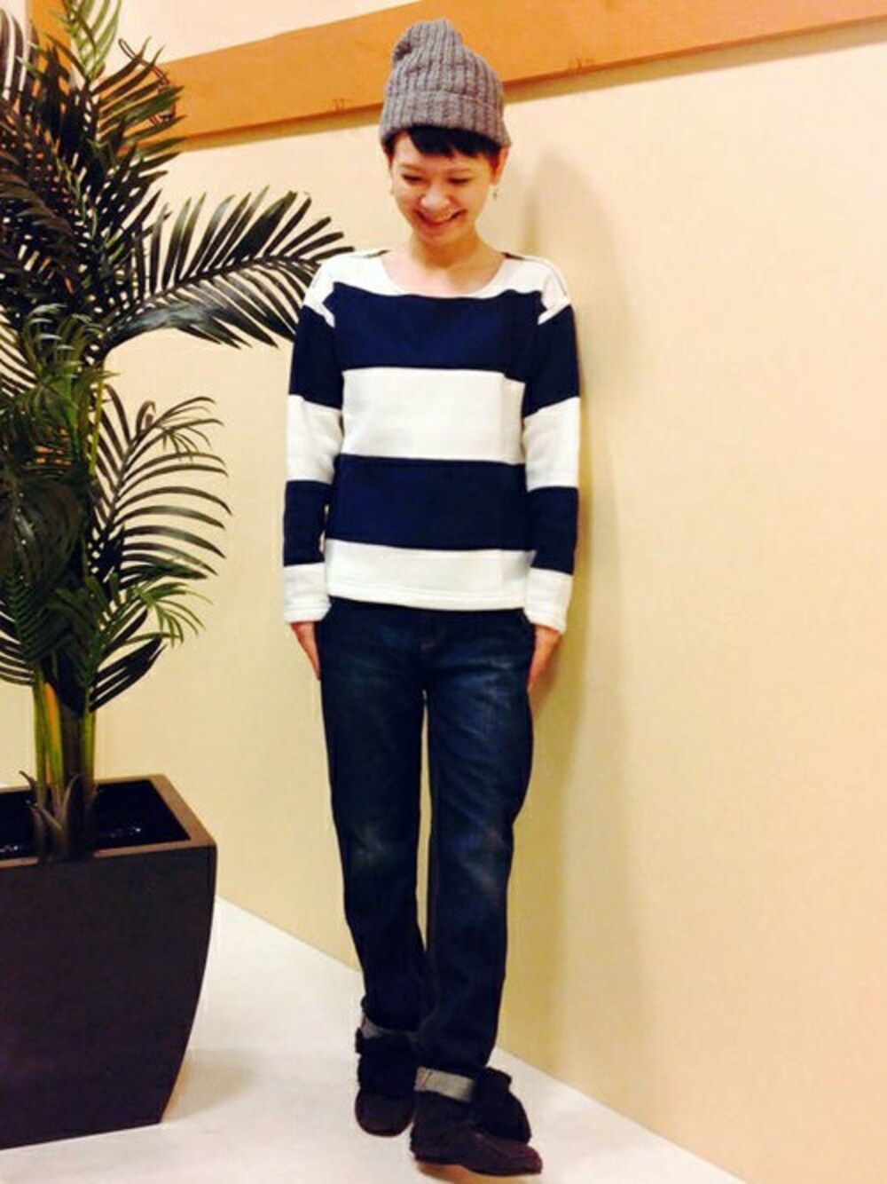 ボーイッシュなカジュアルコーディネートです。 太ボーダーがかわいい裏起毛のトップスは、一枚でもあったかいのがうれしいアイテム。 肩ラインにジップがはいったさりげないデザインも◎ シンプルにデニムとあわせてニット帽をプラスしました♪