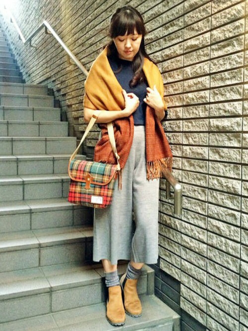 大人の女性らしいワントーンコーデに小物をプラス♪ グレー系にあわせたウェアは、トレンドのボトルネックと落ち感のある素材のガウチョパンツ。 ブラウン系の小物は、グラデーションやチェックで変化をつけつつも、基本のベージュカラーで統一感のある雰囲気にまとめました。
