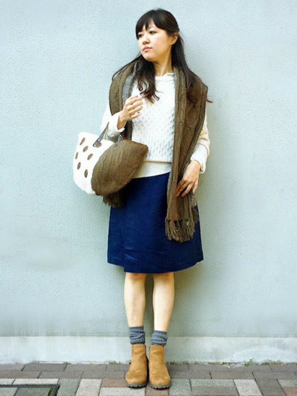 これからの季節に活躍するニットのシンプルコーデです。 ざっくり編みのジャガードニットは、やさしい風合いがポイント。 シャツをインして襟をみせると今年らしさがUPします。 スウェード風のラップスカートをあわせて、少しトラッドな雰囲気に。 小物はそろそろ冬モードです♪