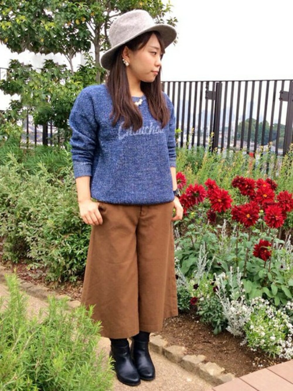 ラフな大人カジュアルコーディネート♪ 杢調のロゴニットは、ハイゲージであったかいのがうれしいアイテム。 トレーナーじゃなく、ニットなのでカジュアルになりすぎないのもポイントです。 ガウチョはトレンドの少し長め丈で、きれいめアイテムとも相性◎。