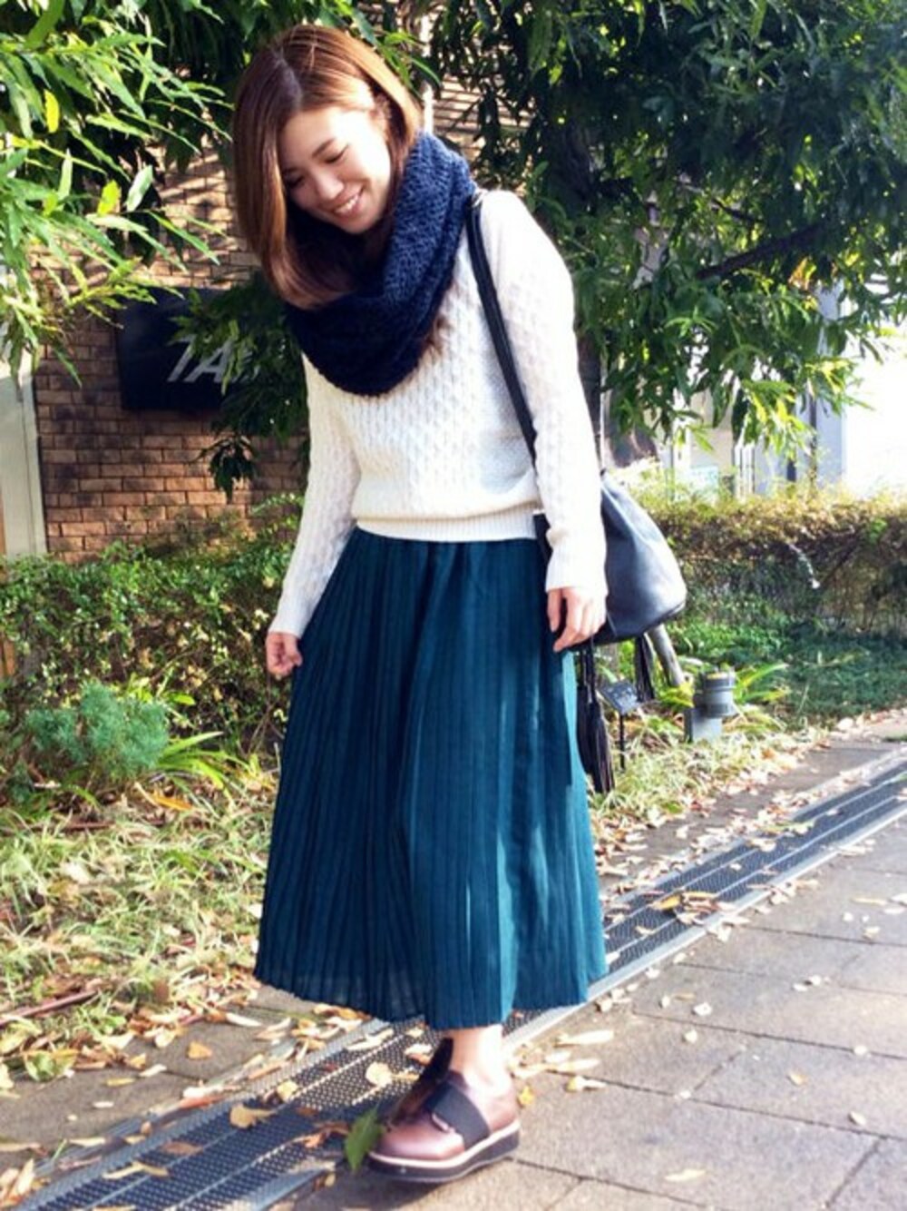 OFFの日におすすめの大人カジュアルコーディネートです。 冬にも活躍するざっくりニット。白はやっぱり持っておきたいカラーです。 スカートは幅が狭いプリーツなので、ガーリーになり過ぎないのが嬉しいポイント。 ストンと落ちるシルエットはとても綺麗です。 スヌードはあたたかいだけでなく、首元にボリュームをだすことで小顔効果がねらえます♪