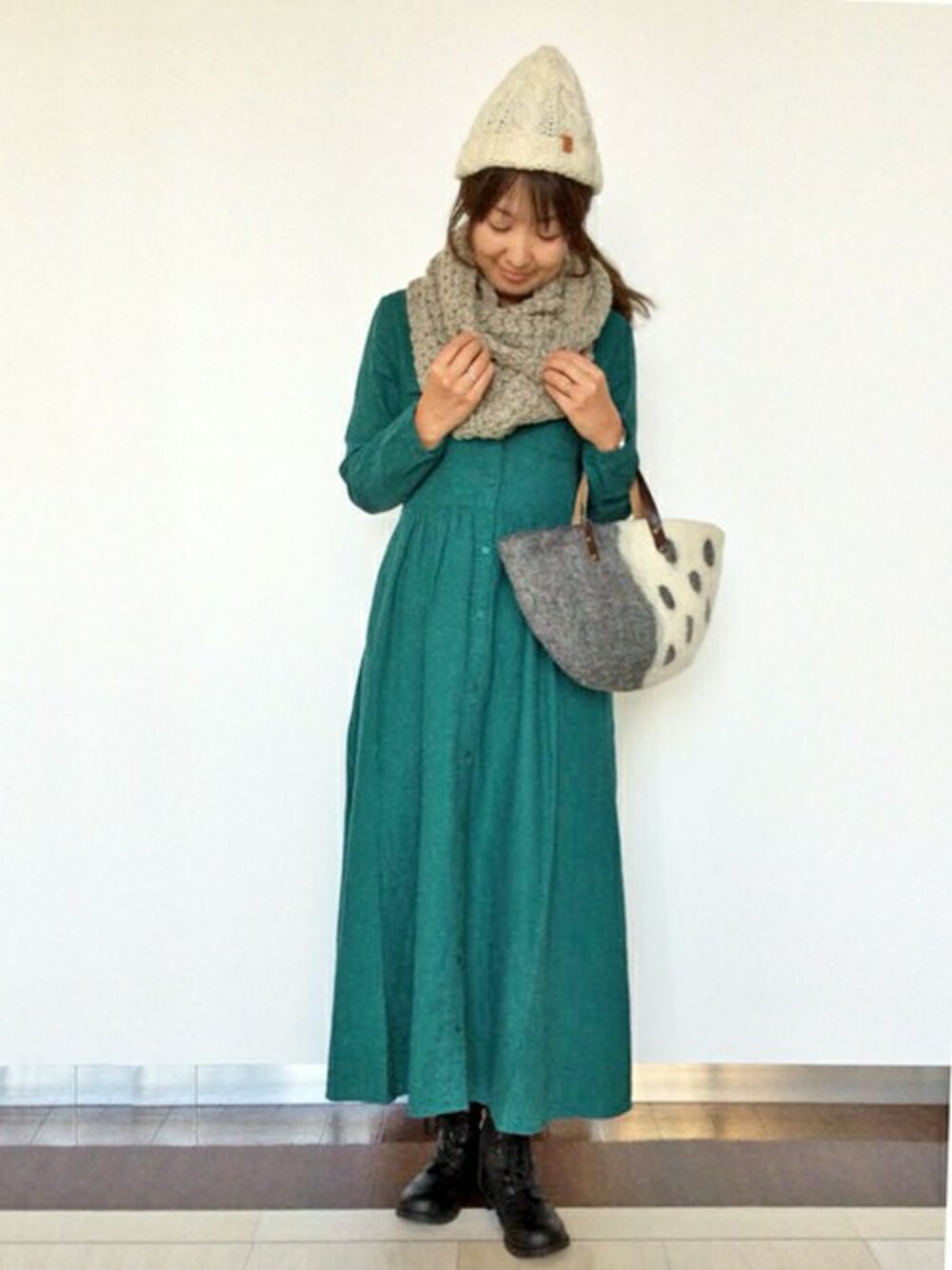 秋のおでかけにおすすめのワンピーススタイル。 深みのあるグリーンのマキシ丈ワンピースは、縦長ラインをきれいに見せてくれます。 ダブルのポケットについたフラップのさりげないミリタリー感も◎ ウエストには切り替えが入っているので1枚でもメリハリのある着こなしになります♪