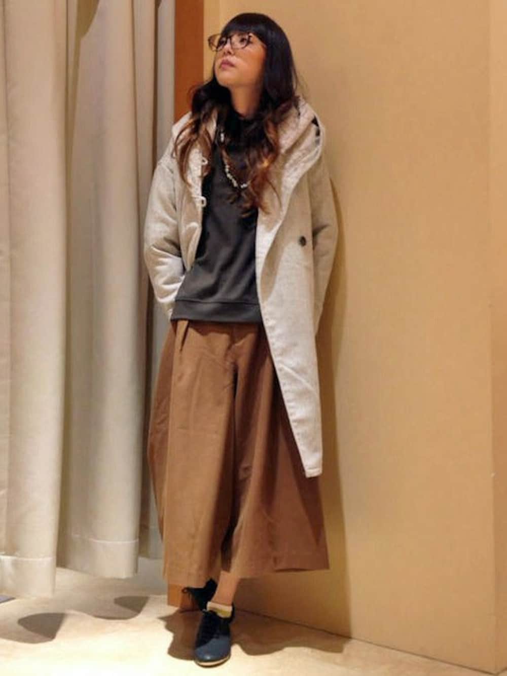 ロング×ロングコーディネートです。 アウターは、フード付きのツイードコート。シンプルなデザインの中に、素材の風合いがひかるアイテム。 ライナーの取り外しができるのもうれしいポイントです。 インは、トレンドのプチハイネック×スカートのようにみえるガウチョパンツをあわせました♪