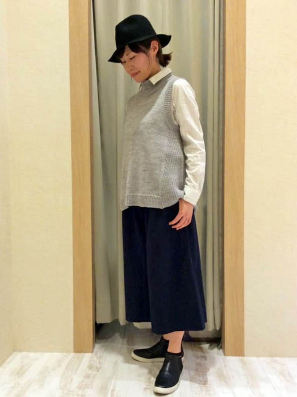 今季大人気のハイネックベストにシャツをinしたオトナカジュアルコーデ。 ニットベストはボーダーのカットソーと合わせても◎横のリブ編み感の違うデザインがポイントです。 トレンドのガウチョパンツは、ウエストの後ろ部分がゴムになっているラクチンアイテム。 スカートのようなボリューム感とフレア感が女性らしい雰囲気をプラスしてくれます。