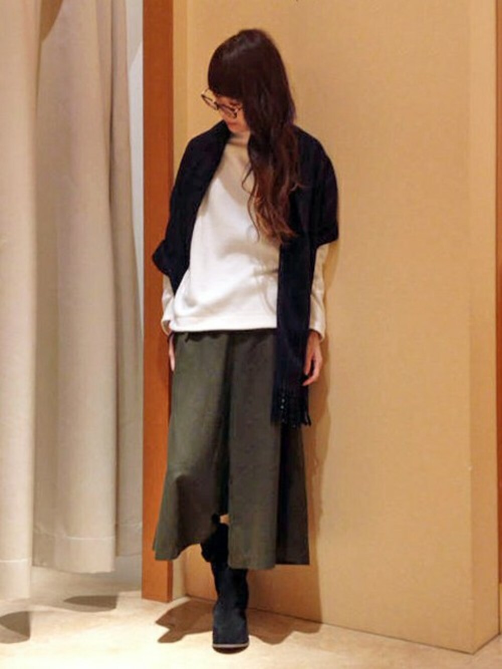 シンプルな中にもトレンドをおさえたラフスタイル。 人気のボトルネックのトップスは、インにもアウトにも着回せるうれしい一枚。 ガウチョは、落ち感のある素材で広がりすぎないのがポイントです。 ウェアがシンプルなので、ストールはストライプなどの柄物がおすすめです♪