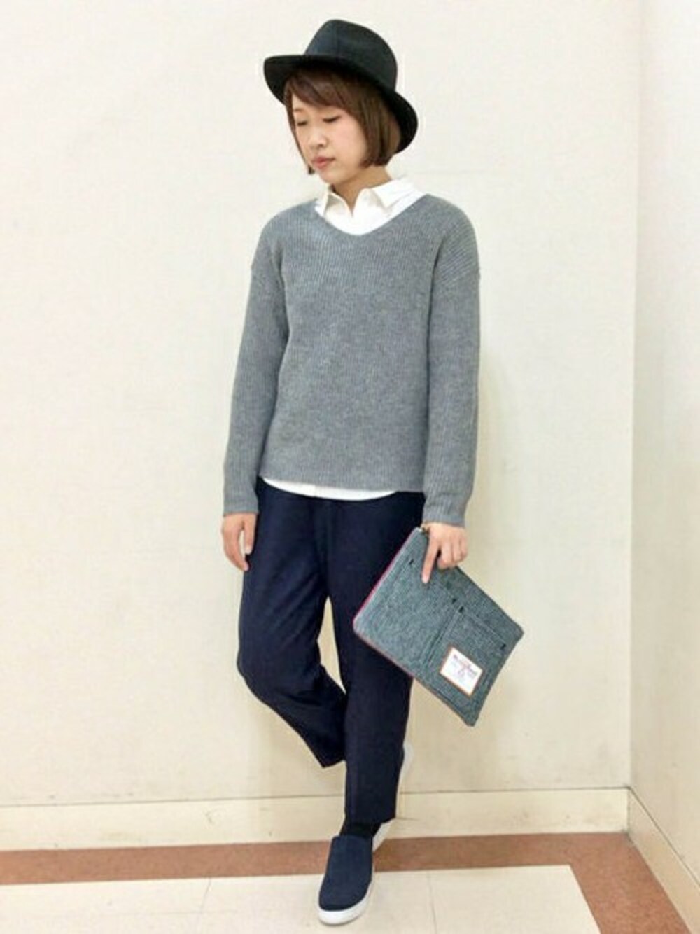 人気のシャツ×ニットスタイルです。 グレーいニットは、今年らしいすこしワイドなシルエットと胸元がすっきりみえるVネックデザインがポイント。 タートルのカットソーをインするのもおすすめです。 パンツは、腰回りがゆったりしてて着心地◎ダボッとした雰囲気はメンズっぽいですが、きれいなタック使いで女性らしい印象のフロントになっています。 ONにOFFに着回せる優秀な一枚です♪ 全体的にシンプルな雰囲気なので、ハリスツイードのクラッチバッグをアクセントに。