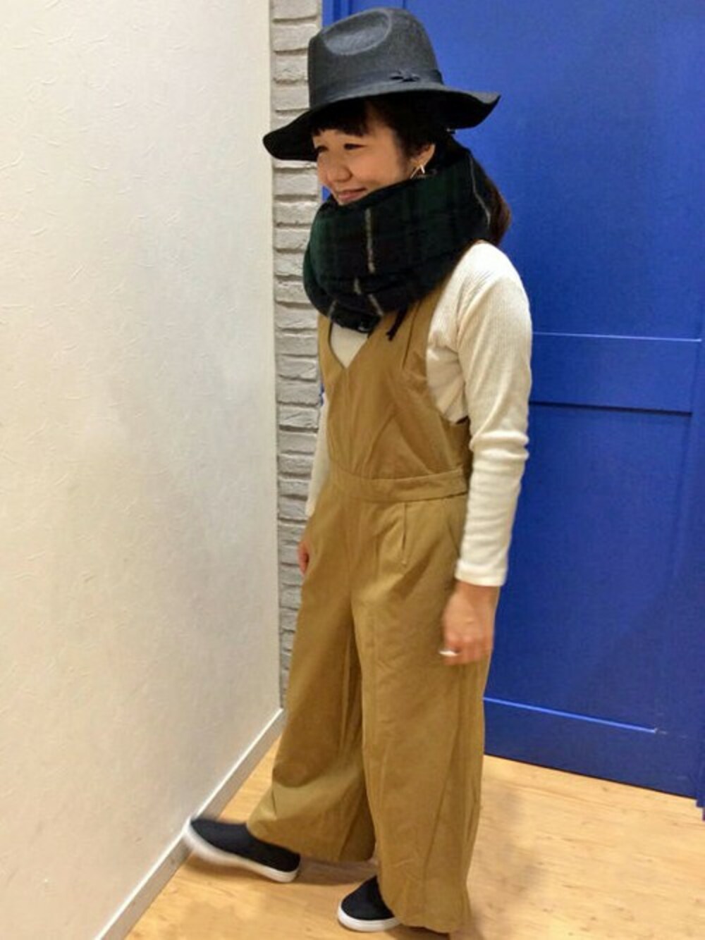 大人デザインのサロペットをカジュアルに。 胸元の深いVネックで肩からのラインがすっきり見えるサロペットは、 ショート丈のアウターやストールをボリューム巻きするのがおすすめです。 ボトム部分は、今年らしいワイドシルエットなのもうれしいポイントです♪