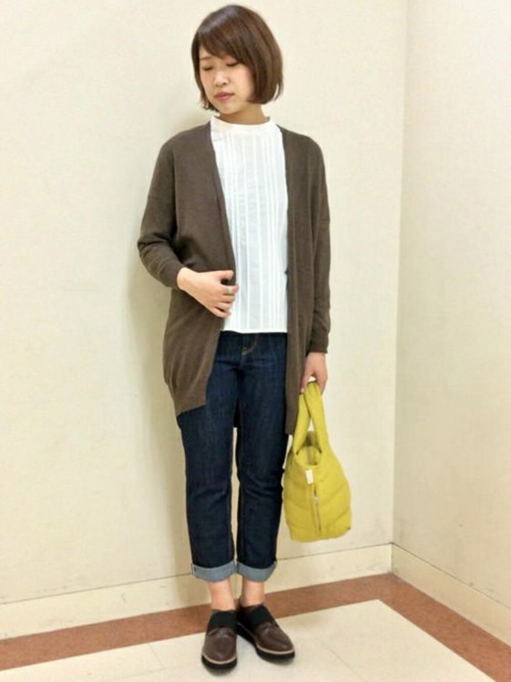 きちんと派のデニムコーディネートです。 デイリーなデニムも、白のシャツとあわせるとキリッとした雰囲気になります。 今の季節は、カーデやロングトッパーを羽織って。 シンプルになりすぎないように、ニット帽や元気カラーのバッグをあわせるのがおすすめです♪