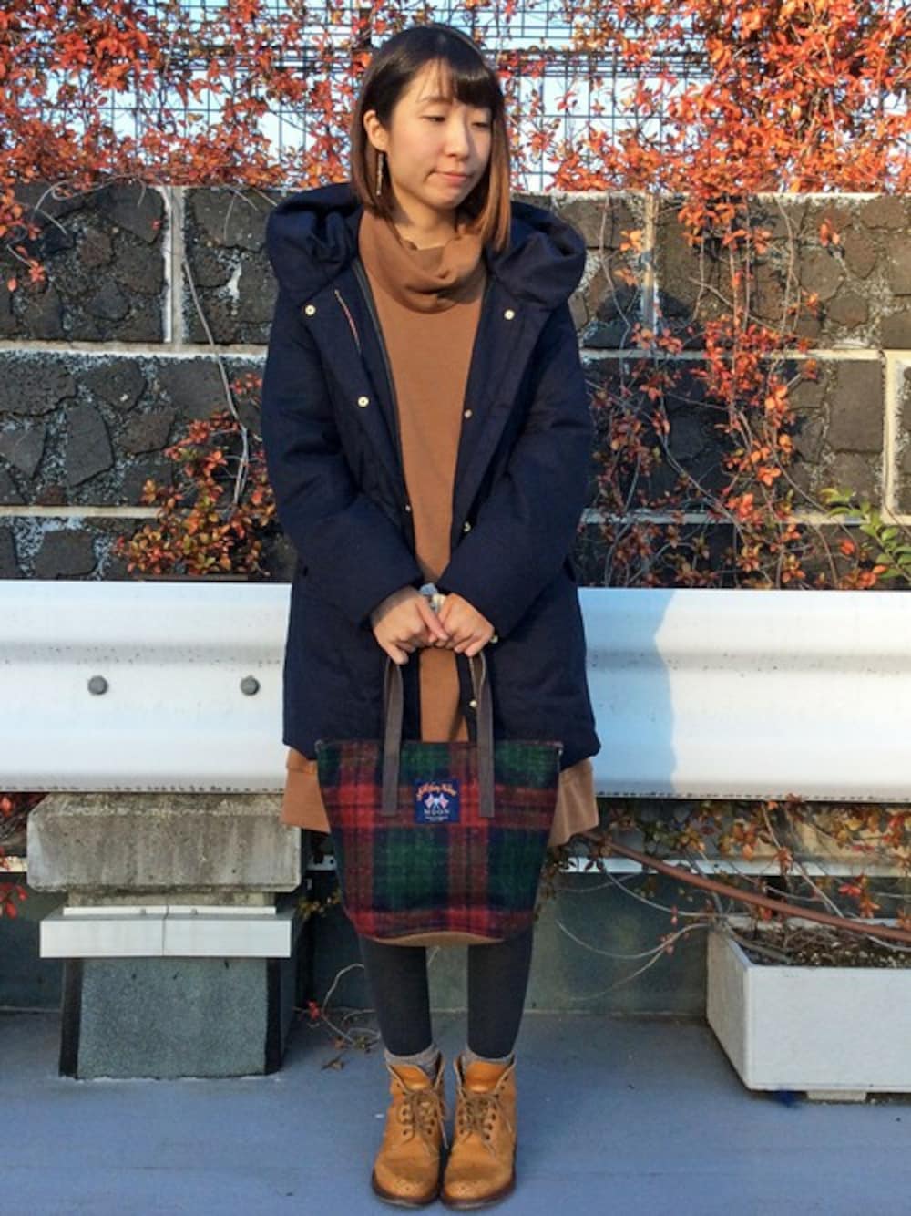 シンプルなワンピースにボリュームアウターをあわせた冬コーデ。 フードにボリュームのあるアウターは冷たくなってきた北風から首元を温かく守ってくれて、嬉しい小顔効果も期待できます♪ 相性抜群のベージュ×ネイビーのチェックのツイードトートでカジュアル感をプラス。 バッグは、このシーズンならではのあたたかみのあるチェック柄でおすすめです♪