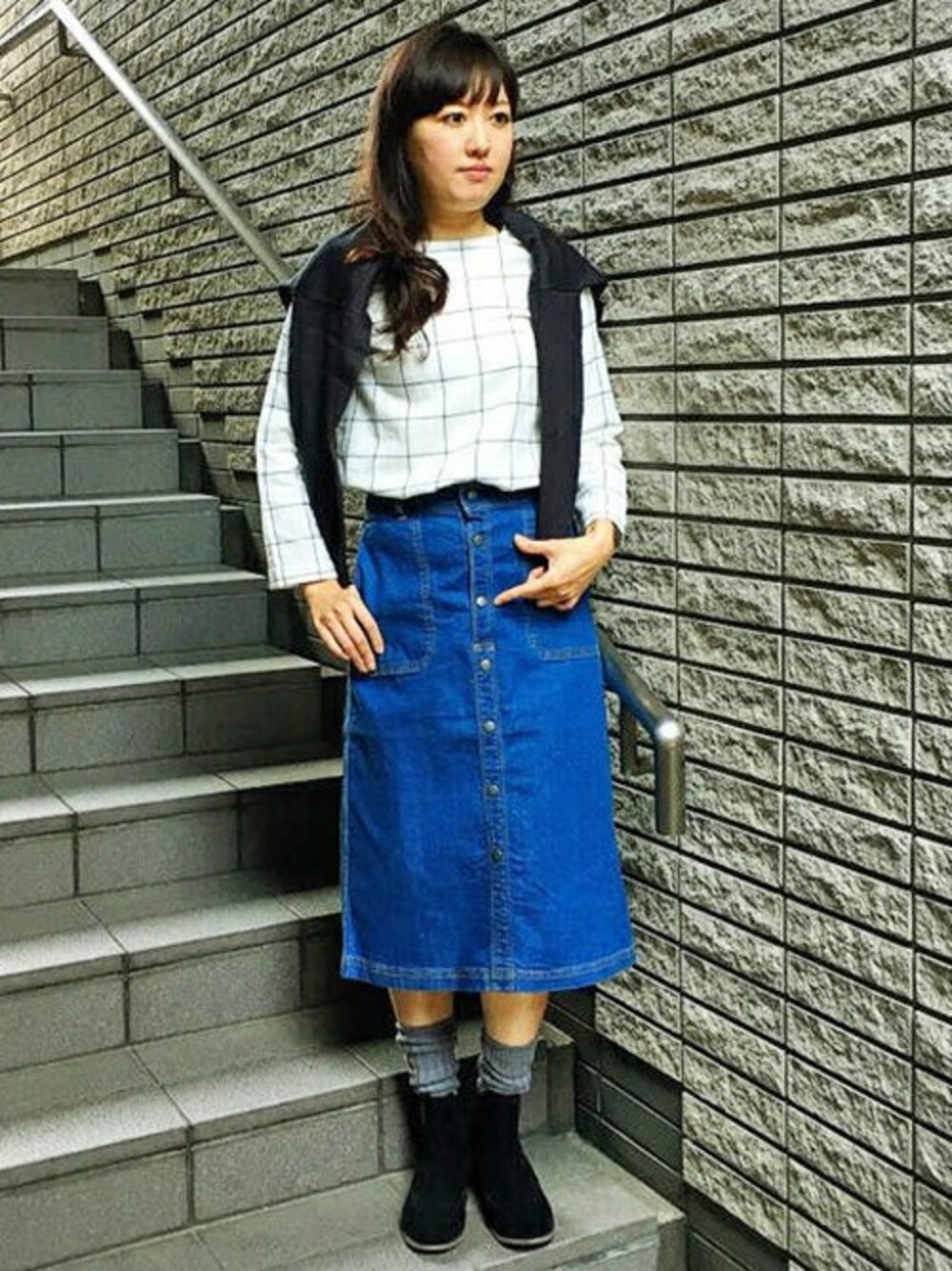 白ベースのチェックブラウスにデニムのスカートをあわせました。 あえて色味は少なくシンプルに大人っぽいデニムstyleに。 ブラウスは、1枚で着ても襟のあきが気にならない形でハイネックカットソーとレイヤードしても◎ 前ボタンがレトロなスカートのデザインは、デニムのカジュアル感をおさえてくれます♪