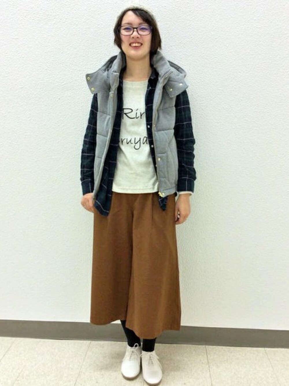 春まで活躍するカジュアルコーディネートです。 Tシャツ+チェックシャツ+中綿ベストのカジュアルなレイヤードに、きれいめガウチョパンツをあわせました。 スポーティーなアイテムも、ボトムス効果で大人っぽい印象になりますよ♪ インナーや小物を白にすると、春っぽさがプラスされます。
