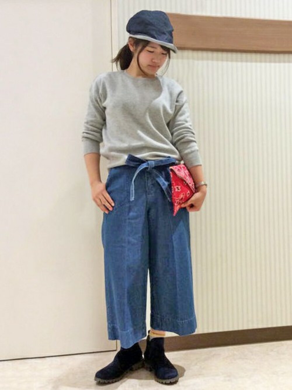 春を意識したマリンスタイル。 ワイドパンツのマニッシュ感に、ウエストリボンで甘さをプラス。デニムも柔らかく、ウエストもゆったりでとっても履きやすいです。 シンプルなスウェット風プルオーバーは、首回りや袖、裾のリブ編みがポイント。 ゆったり×ゆったりのコーデでも、ウエストマークされていることによってすっきりとした印象になります。 春注目されているバンダナ柄のクラッチバッグをアクセントにしました♪