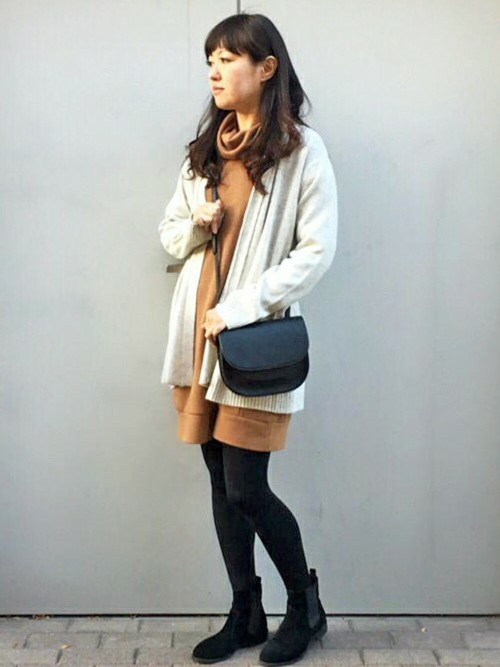 ワンピース+カーデのラクチンコーディネート。 オフタートルが今年らしいワンピースは、ゆるっとしたデザイン。細身のパンツとあわせてカジュアルにも着まわせます。 カーデは、人気のロング丈。大きめのポケットがかわいいアクセントになっています。 小物は、黒であわせて。オールシーズン使える合皮ショルダーは、いろいろなシーンに活躍してくれそうです♪