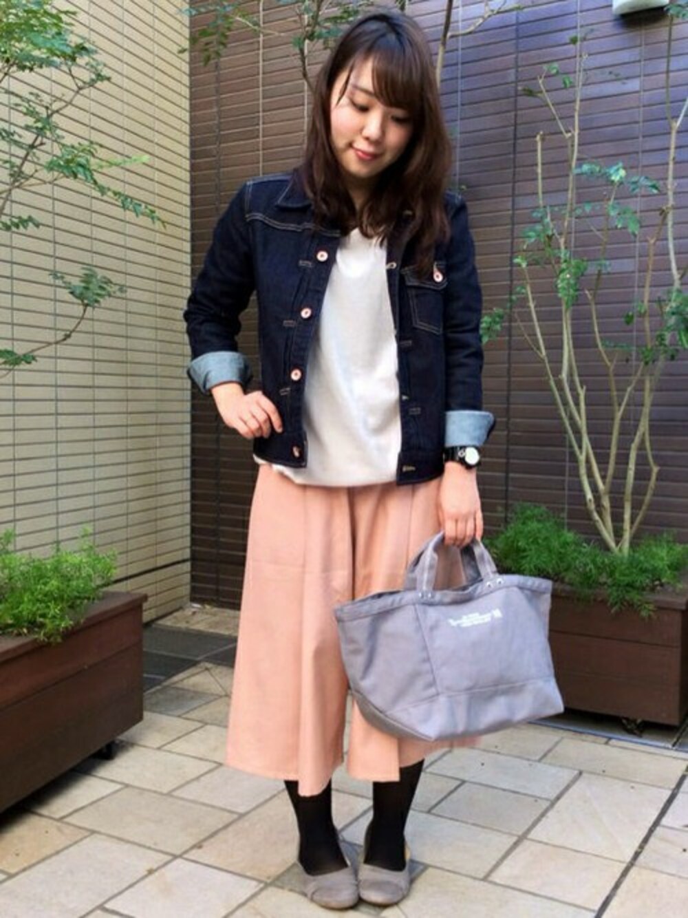 きれいめシンプルコーディネートにカジュアルアイテムをプラス♪ 春らしいオレンジピンクのガウチョパンツは、スカートのようなボリューム感がポイントです。 シンプルな白ニットをあわせて、Gジャンで全体を引き締めました。 デニムはこの春もトレンド素材。袖をロールアップしてコンパクトに羽織るのがおすすめ。
