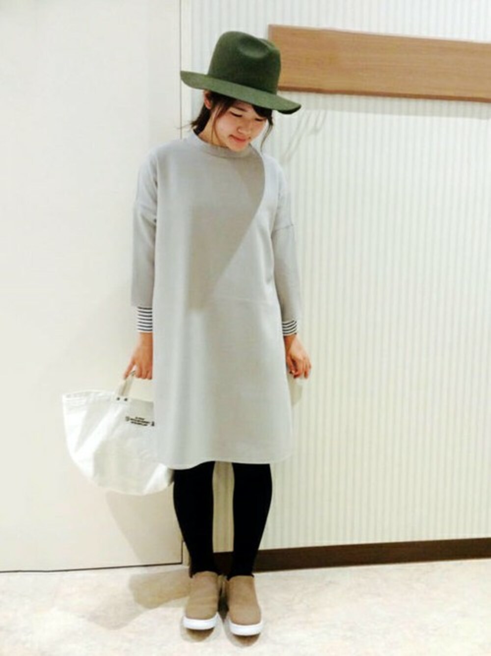 おでかけワンピースコーディネートです。 ワンピースは、ゆるっとシルエットのシンプルなアイテムで、さらさらとした触り心地も◎ プチハイネックやちょっとフレアになった七分袖が女性らしい雰囲気です。 フェルトハットとロゴがかわいいデニムバッグ、スニーカーで少しカジュアルに仕上げてみました♪