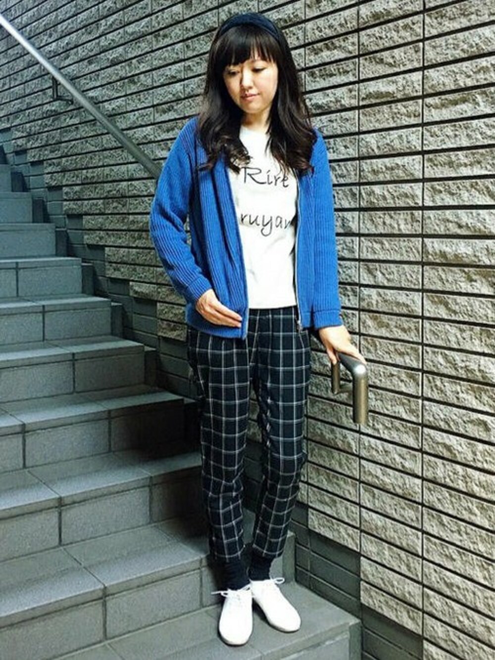 白×ブルーの爽やかなパンツスタイルです。 人気の畦編みのカーディガンは、前ジップでパーカーのようにラフに羽織れるアイテム。 インにTシャツをあわせるとよりカジュアルになります。 トップスはシンプルなので、ボトムスは大人チェック柄。 足元は、白シューズで春らしくまとめました♪