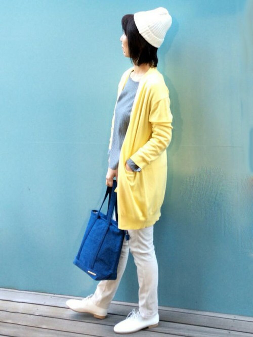キレイな春イエローをとりいれたパンツコーディネート。 キレイめイエローのロングトッパーに、 グレーのカットソーとホワイトデニムをあわせました。 明るいカラーでおでかけに行きたくなります♪ 小物は、この春トレンドのデニム素材のトートバッグでとりいれました。 荷物多めの人に、おすすめのサイズ感です。