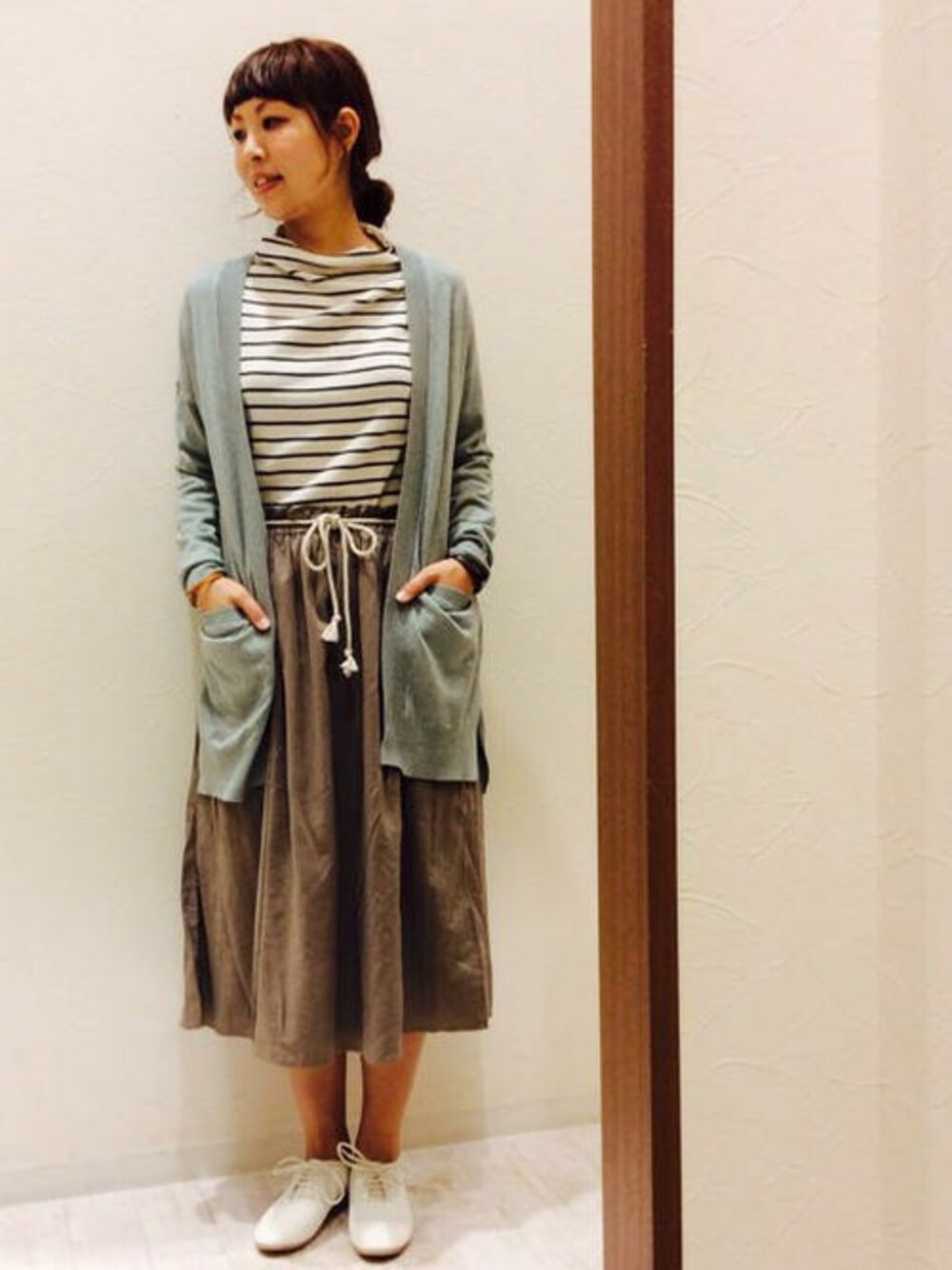 ナチュラルな雰囲気のスカートスタイル。 ベーシックなボーダーTもボトルネックでこだわりました。 ボリューム感のあるギャザースカートは、少し長めの丈感が今年らしい一枚。 トップスインで、紐ベルトをアピールするのがおすすめです♪