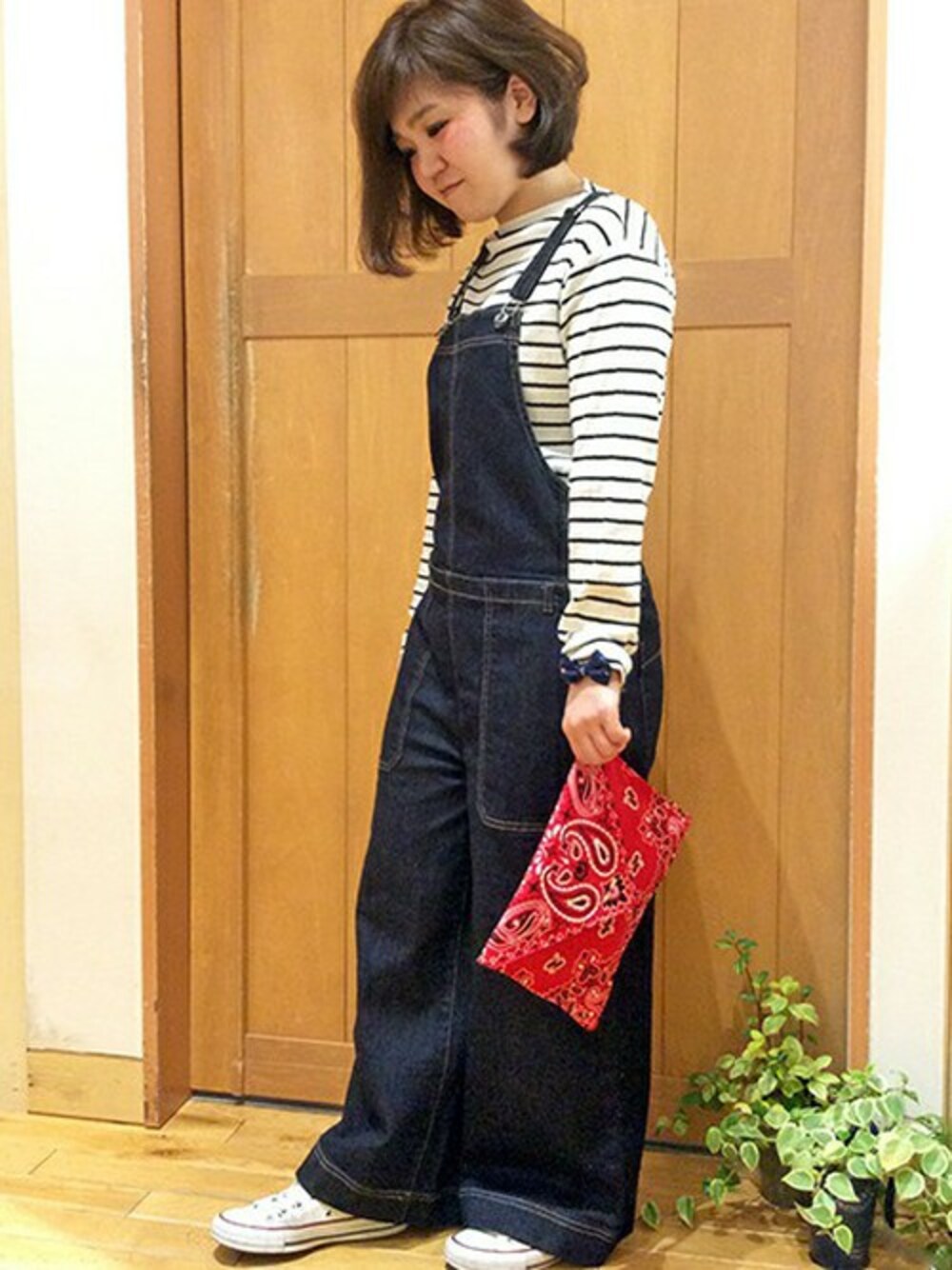 春のお出かけにおすすめのオーバーオールスタイルです。 子供っぽくなりがちなオーバーオールも、ボトム部分がワイドシルエットでトレンド感◎ 定番のボーダーTとあわせつつ、注目のバンダナ柄クラッチバッグをアクセントにしました♪