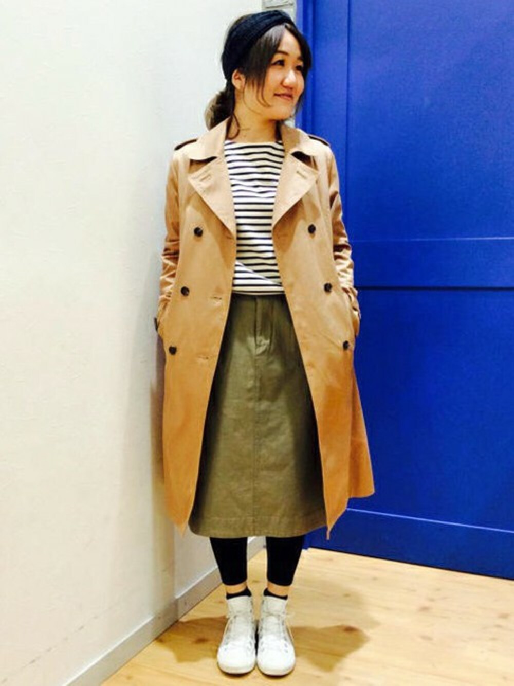 春に人気のトレンチコートをカジュアルダウンしました♪ ボーダーT+スカートのシンプルスタイルも、トレンチを羽織るだけで今年らしい着こなしになります。 小物はヘアバンドやスニーカーでライトにスタイリングするのがポイントです。
