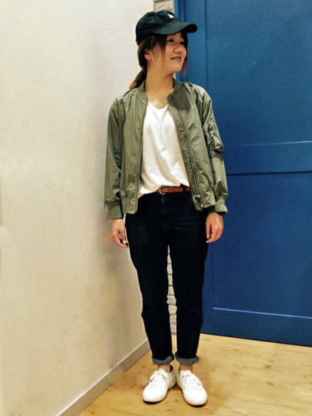カーキ×ホワイト×ネイビーのバランスが春らしいパンツスタイル。 人気のMA-1は、シャリ感のあるタイプライター生地で、シャツのように軽く羽織れる一枚。 定番ボトムからトレンドのガウチョなど、ボトムを選ばないコンパクトなデザインです。 今回は、デニムパンツとキャップを合わせてボーイッシュにまとめてみました♪