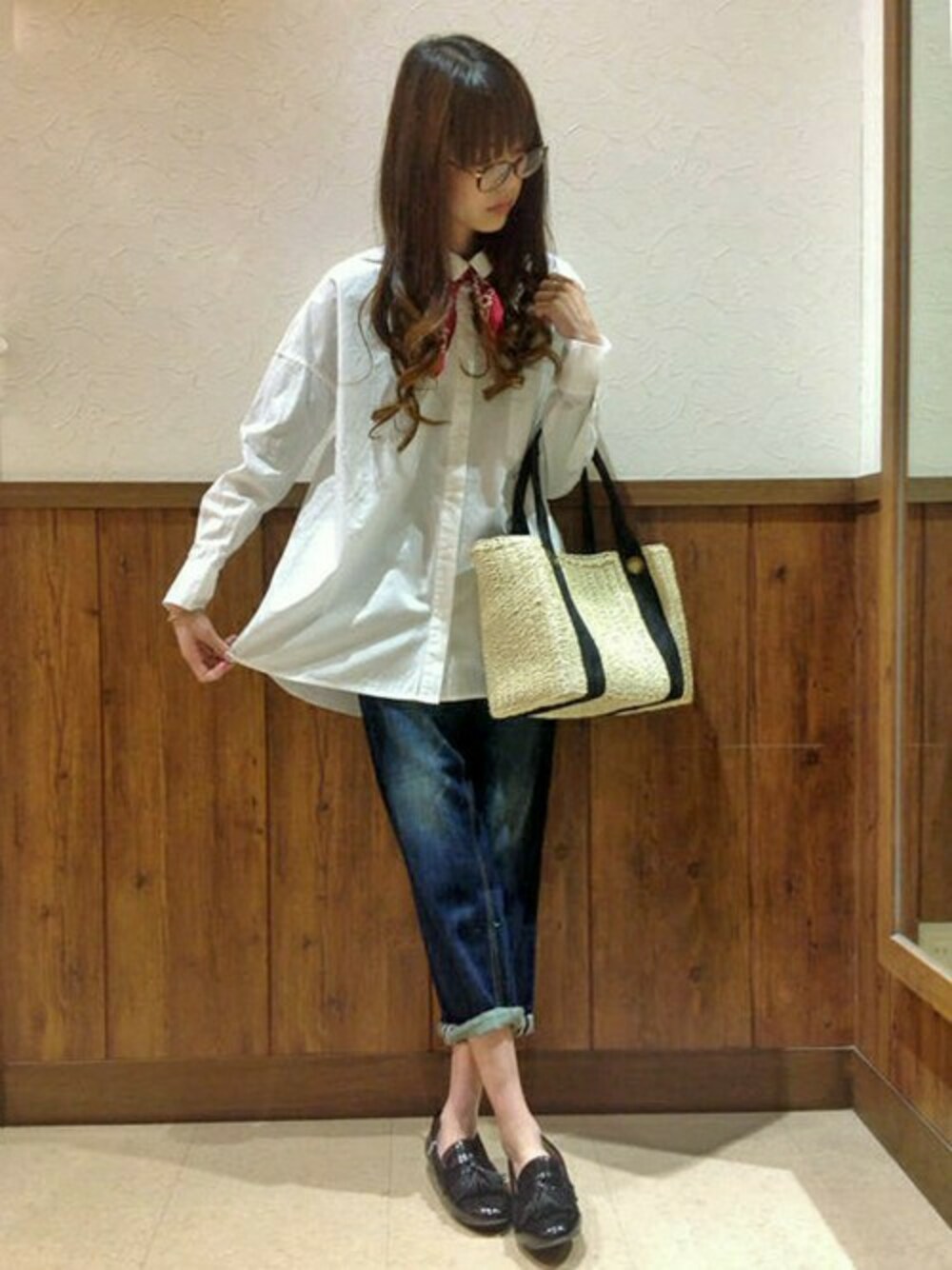 技ありの、シャツ×デニムコーディネート。 定番のシンプルな組み合わせの中に、トレンド小物を取り入れて、こなれた感をプラス。 シーズンアイテムのかごバックは、取り入れやすく、合わせるだけで季節感を演出できるのでオススメです。 ホワイト×ネイビーの中に、バンダナスカーフの赤色をアクセントにしました♪
