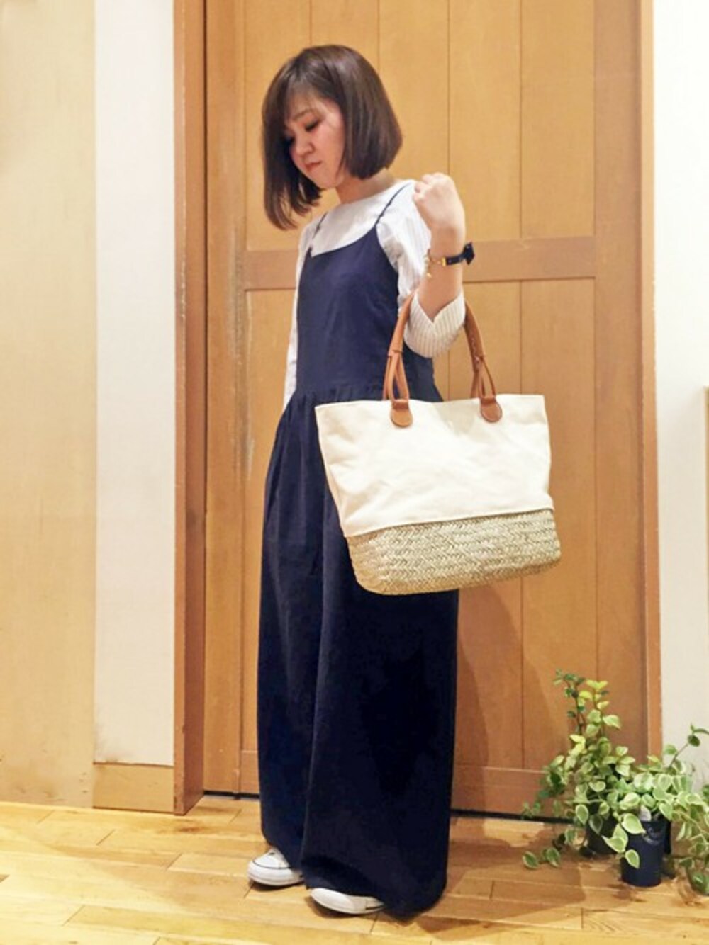 GWのオススメお出かけコーディネート。 一枚でコーディネートがキマるサロペットをメインアイテムにしました。 すべりが良く肌にまとわりつかない素材なので、汗ばむ季節でも快適に過ごせるのでオススメです。 ボトム部分はたっぷり広がるガウチョスタイルになっています。 GWのお出かけに活躍する、大きめのかごバックを一緒にを合わせてみました。