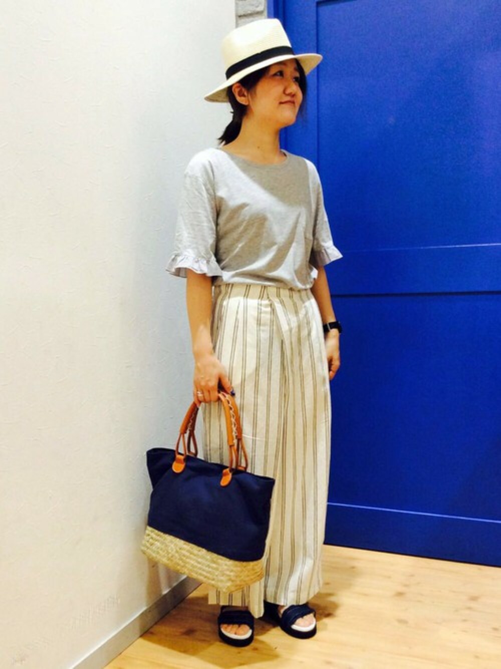 お出かけリラックスコーディネート。 カジュアルとフェミニンのバランスが絶妙な袖フリルのTシャツ。 デザイン重視のトップスなら、薄着になる季節にも一枚で着映え度バツグンです♪ ストライプ柄のガウチョパンツが夏らしく、サンダルと合わせてラクチンスタイルにしてみました。
