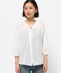 初夏の爽やかコーディネート。 ブラウスはボリューム袖になっていて、ふんわりとした女性らしいシルエット。 淡いカーキのボトムスが夏っぽい雰囲気でオススメです。 羽織には着回し抜群のロングジレを合わせ、オシャレ感を出してみました♪