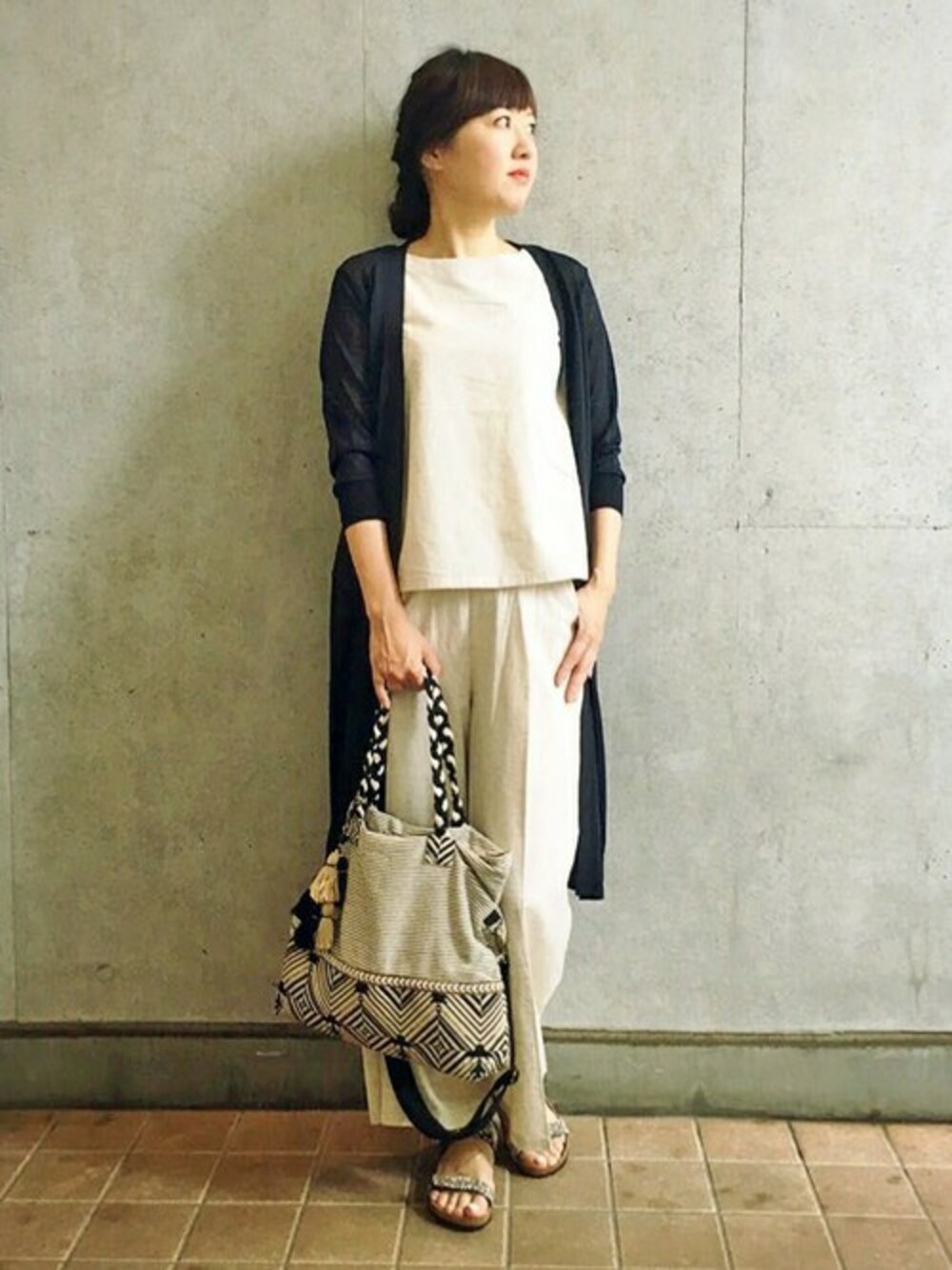 人気のセットアップアイテムを主役にしたコーディネート。 落ち着きのあるオフホワイトのセットアップスタイルです。 深みのあるネイビーのロングカーディガンを合わせシックな雰囲気にしてみました。 バックも同色あわせで自然になじませてます。