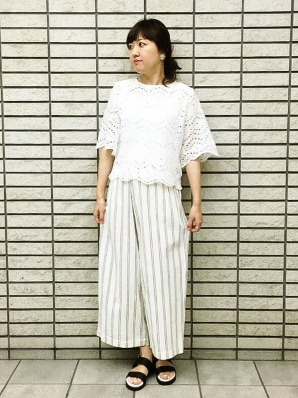 ホワイトカラーでまとめたフワゆるコーディネート。 ブラウスは程よい透け感で涼しい印象になってます。 レース柄×ストライプ柄をmixすることで上下にメリハリをつけてみました♪