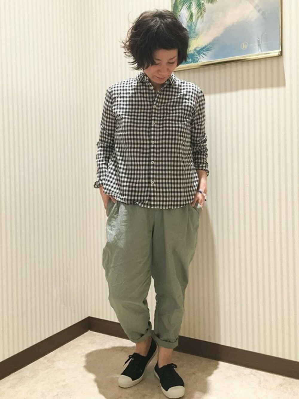 チェックのシャツを使ったカジュアルコーディネート。 人気のギンガムチェック柄は合わせやすく、1枚でもコーディネートの主役になるのでオススメです。 カーキ×ブラックでシンプルにまとめてみました。