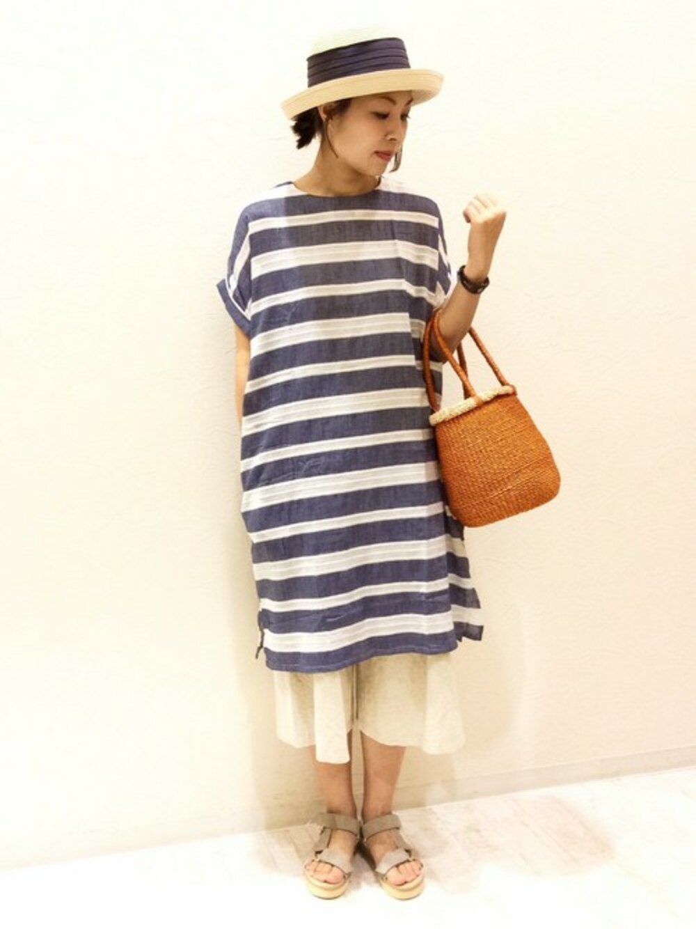 夏らしいブルーとホワイトのボーダーワンピースを使ったコーディネート。 ガウチョパンツを合わせて、リラックススタイルにしてみました♪ 丸みのあるオレンジの雑材バッグがアクセントになってます。
