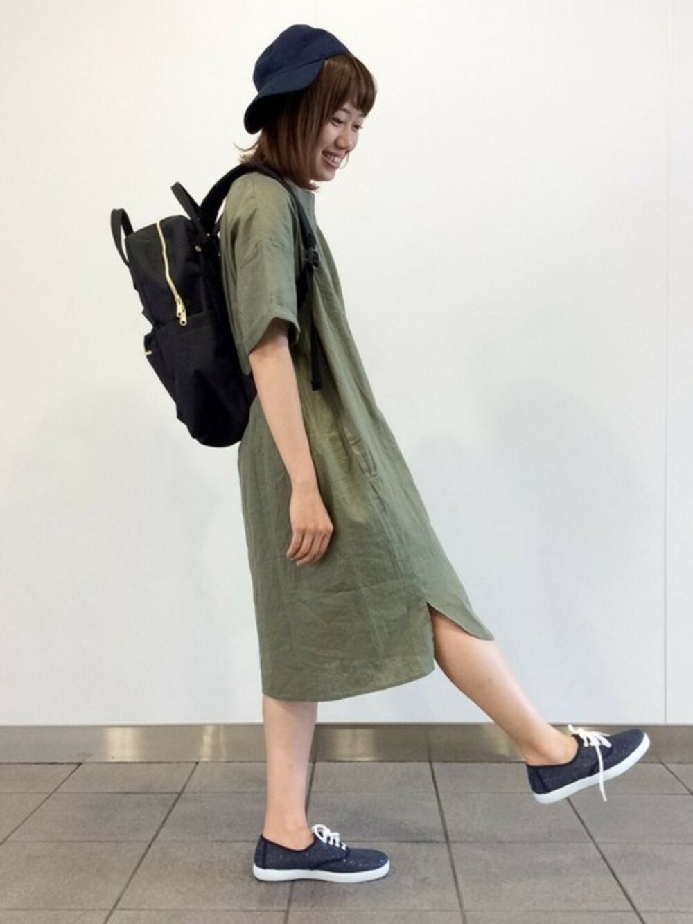 初夏のカジュアルらくちんスタイル。 リネン素材で清涼感のあるワンピースで初夏の陽気にピッタリです。 スニーカー・キャップ・リュックをあわせスポーツMIXにしてみました♪