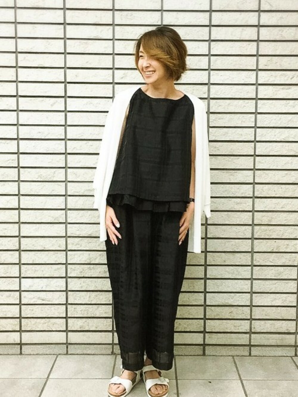 シャドーチェック柄が上品で落ち着きのあるトップス&ボトムスのセットアップコーディネート。 ブラック×ホワイトでモノトーンスタイルにしてみました。 カーディガンは肩掛けでコナレ感をプラス♪
