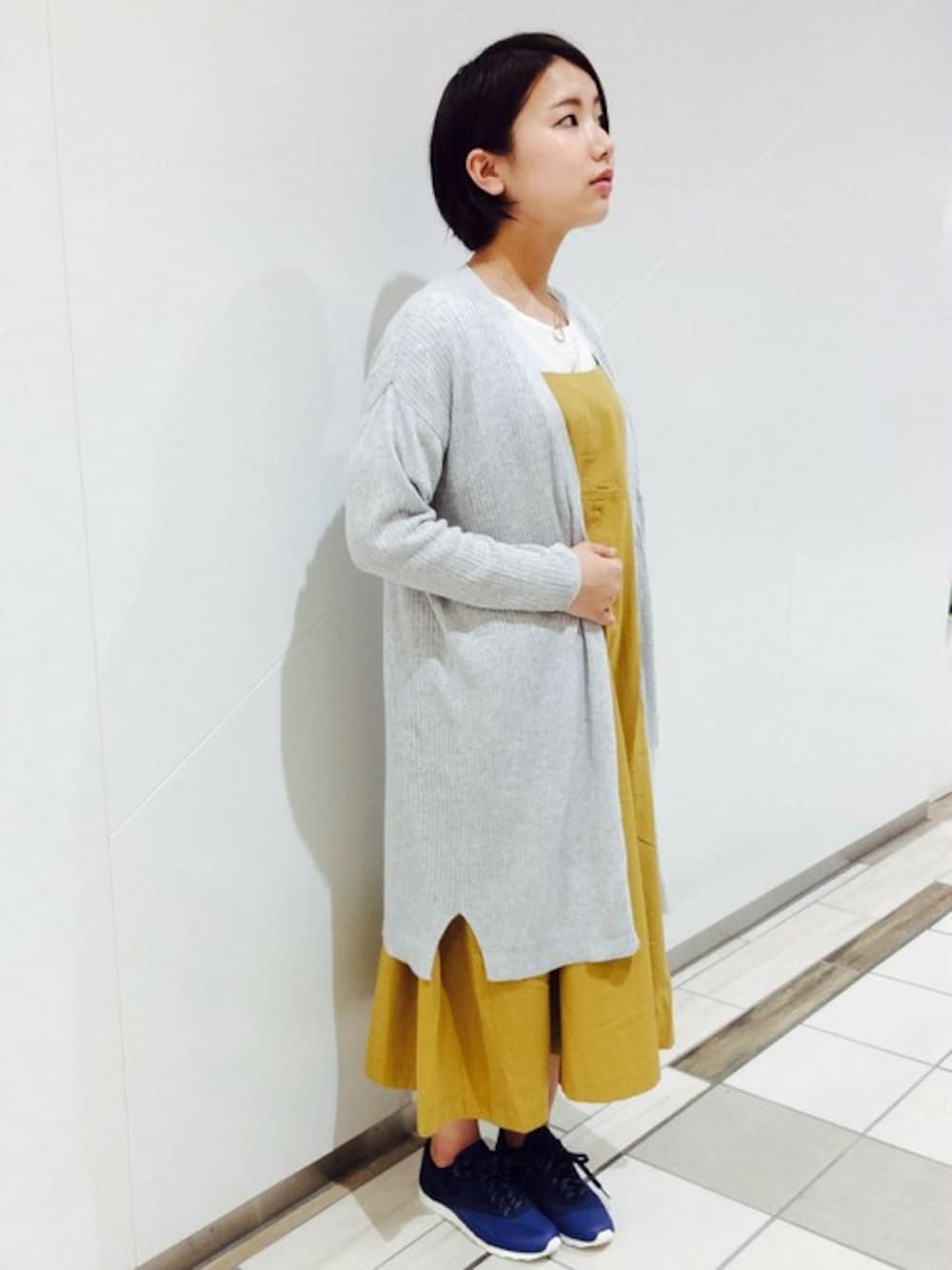 初夏のラクチンスタイル。 ゆったりとしたワンピースにロング丈のカーディガンを合わせ柔らかい印象にしてみました♪ 明るいイエローがアクセントカラーになってます。