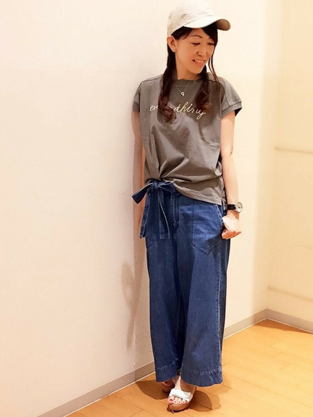 ロゴTシャツを使ったコーディネート。 デニムのロング丈スカートで落ち着いた雰囲気が◎ キャップを合わせてカジュアルダウンしてみました♪