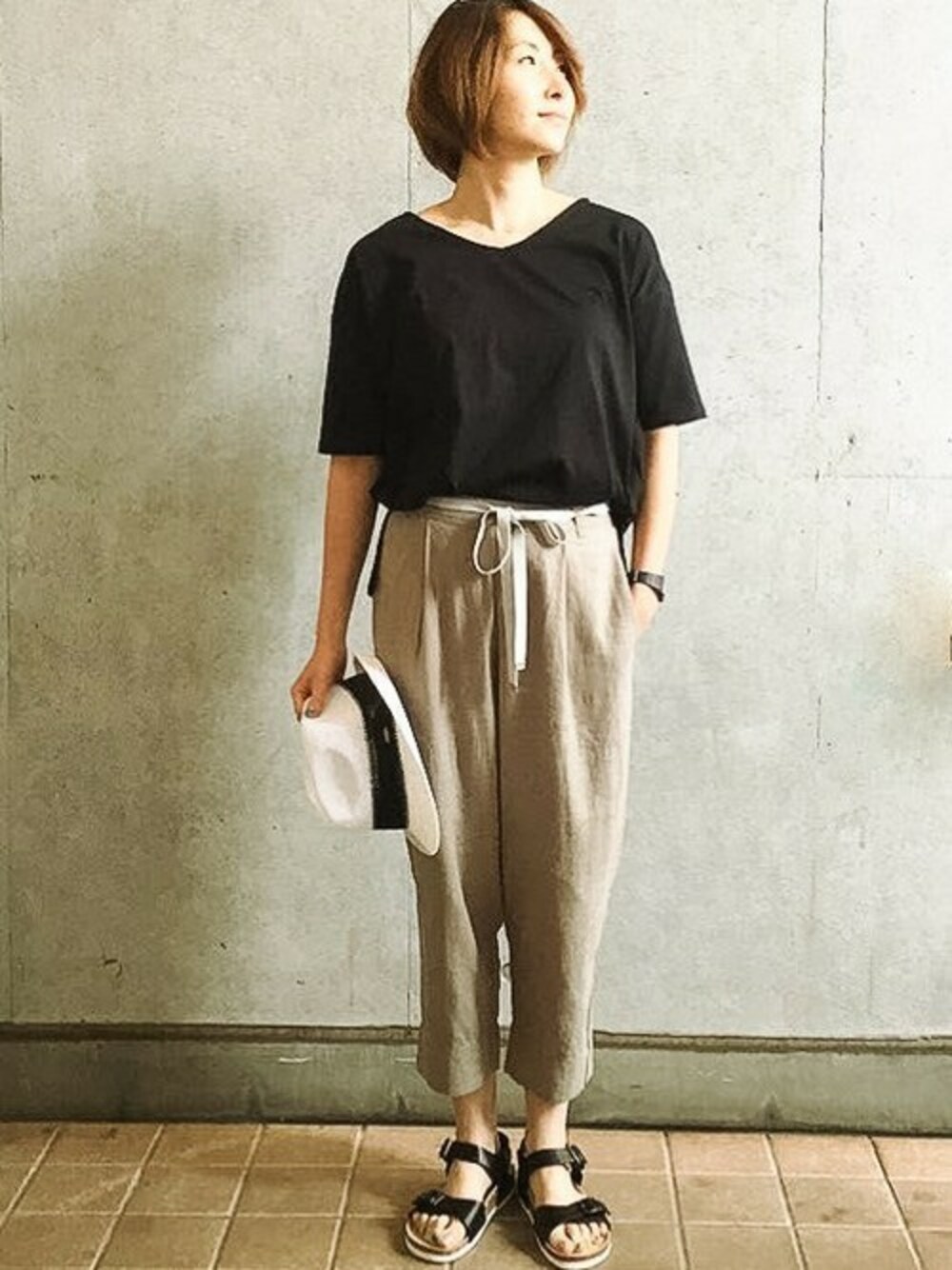 トーンを抑えたシンプルコーディネート。 ポイントにブラックをまとめて落ち着いた雰囲気が◎ ボトムスはリネンが混ざっているので心地よい肌触りになってます♪