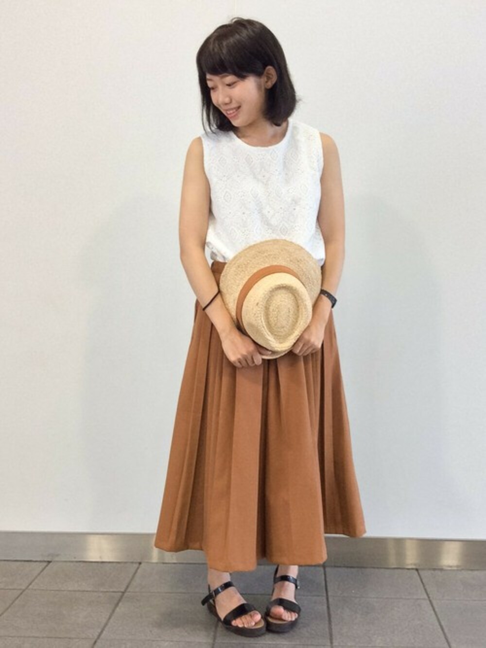 ノースリーブのトップスを主役にしたコーディネート。 レース柄が女性らしいデザインになってます。 ノースリーブで清涼感があり初夏スタイルにオススメです♪