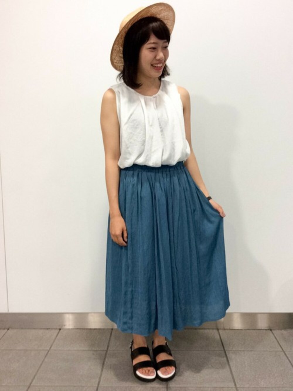 キレイなブルーカラーのスカートを主役にしたコーディネート。 ホワイト×ブルーで清涼感◎ ふんやりシルエットのスカートにノースリーブのトップスをインして今年らしいスタイリングにしてみました♪