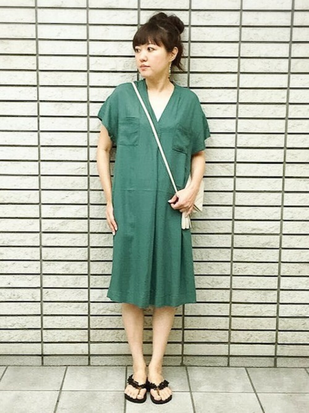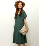 すっきりとしたVネックワンピースを使ったコーディネート。 身幅をたっぷり取っているのでリラックス感◎ コンパクトサイズのショルダーバッグを合わせ、ちょっとしたお出かけにオススメなスタイルになってます♪