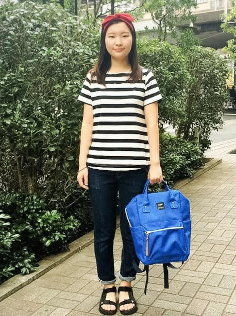 ボーダー×デニムのカジュアルコーディネート。 定番のボーダー柄スタイルに小物で変化をつけてみました。 ポイントカラーのレッド&ブルーがアクセントになってます♪